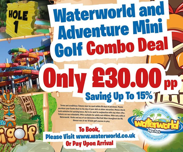 We have some great package deals, which include Waterworld & Mini Golf combo deal for £30.00 per person. The Adventure Mini Golf includes a round of 18 holes and is valid for up to 30 days after your visit to Waterworld. Combo tickets are non-refundable.